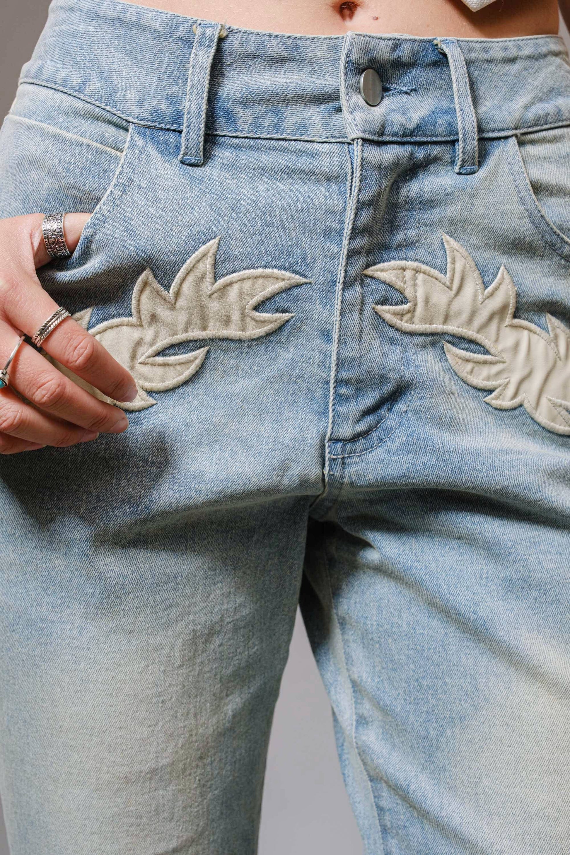 Mid-rise denim jeans featuring Western-inspired contrast patch stitching and a stretch fit for comfort.